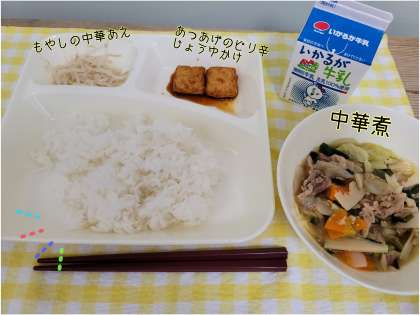 中華煮、あつあげのピリ辛じょうゆかけ、もやしの中華あえ、ごはん、牛乳です。