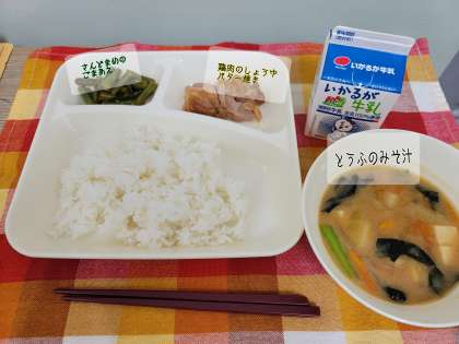 今日の献立は、鶏肉のしょうゆバター焼き、とうふのみそ汁、さんどまめのごまあえ、ごはん、牛乳です。