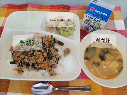 今日の献立は、豚ひき肉とにらのそぼろ丼、みそ汁、キャベツの赤じそあえ、牛乳です。