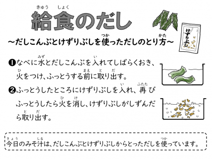 給食のだしこんぶとけずりぶしを使っただしのとり方は下の図の通りです。