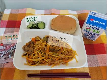 今日の献立は、スパゲッティミートソース、きゅうりのピクルス、アーモンドフィッシュ、