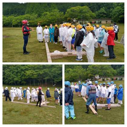 各クラスに分かれて「いかだづくり」がはじまりました。