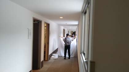 起床後、2人で協力してシーツを畳んでいます。