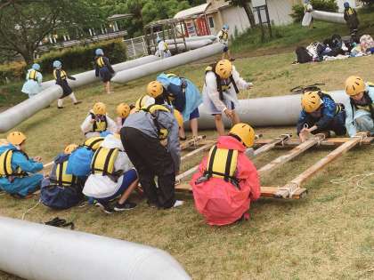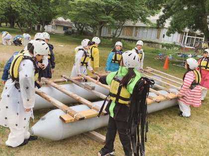 いかだレースが終わり、みんなで作ったいかだを、みんなで解体しています。