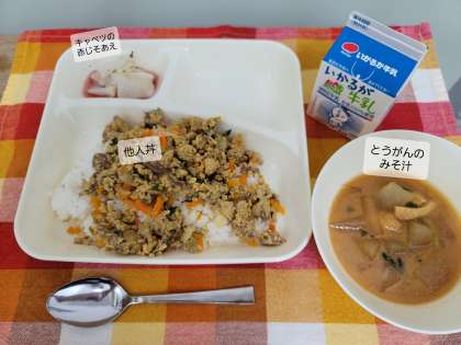 今日の献立は、他人丼、とうがんのみそ汁、キャベツの赤じそあえ、牛乳です。