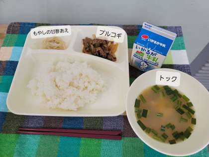 今日の献立は、プルコギ、トック、もやしの甘酢あえ、ごはん、牛乳です。