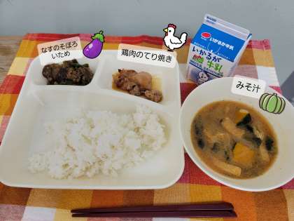 今日の献立は、鶏肉のてり焼き、みそ汁、なすのそぼろいため、ごはん、牛乳です。