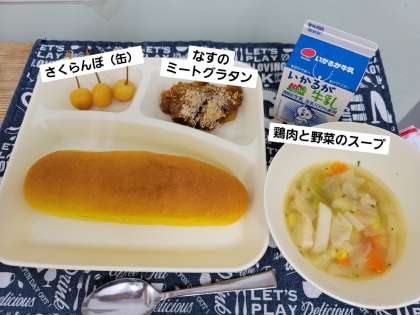 今日の献立は、なすのミートグラタン、鶏肉と野菜のスープ、さくらんぼ(缶)、パンプキンパン、牛乳です。