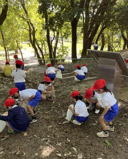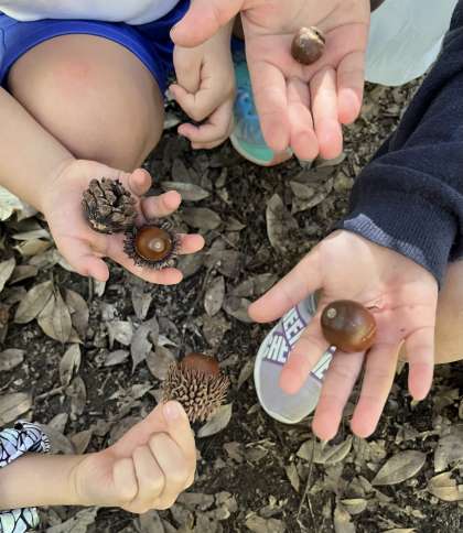 どんぐり、松ぼっくり、落ち葉、おもしろい形の枝など発見がたくさんあります。