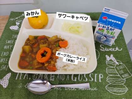 今日の献立は、ポークカレーライス[米粉]、サワーキャベツ、みかん、牛乳です。