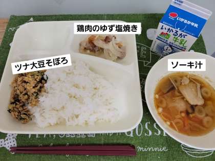 今日の献立は、鶏肉のゆず塩焼き、ソーキ汁、ツナ大豆そぼろ、ごはん、牛乳です。