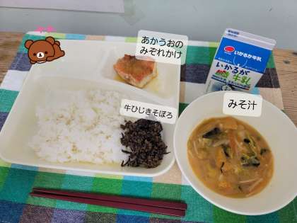 今日の献立は、あかうおのみぞれかけ、みそ汁、牛ひじきそぼろ、ごはん、牛乳です。