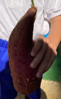 ?10月31日に、学校の学習園で、サツマイモを掘りました。管理作業員さんから、芋掘りのコツも教わりました。こんなに大きなものもありました。