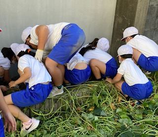 > 収穫の後は、みんなで力を合わせて、ツルや葉を片付けました。