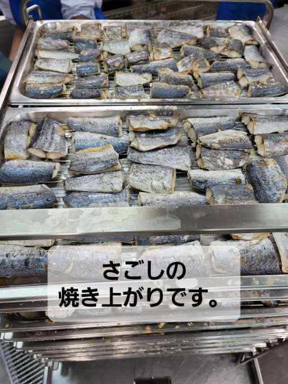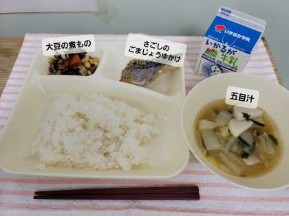 今日の献立は、さごしのごまじょうゆかけ、五目汁、大豆の煮もの、ごはん、牛乳です。