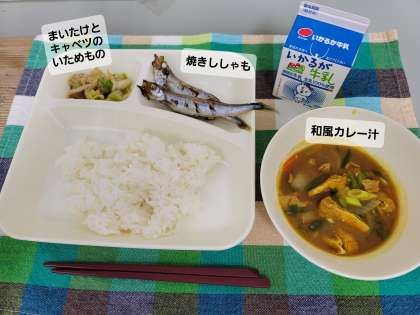 今日の献立は、焼きししゃも、和風カレー汁、まいたけとキャベツのいためもの、ごはん、牛乳です。