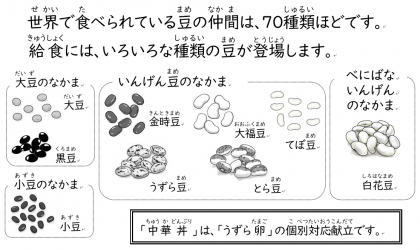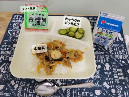 今日の献立は、中華丼、きゅうりのピリ辛あえ、ソフト黒豆、牛乳です。