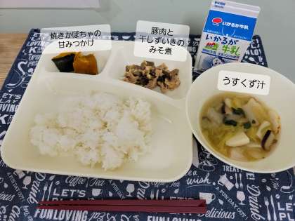 今日の献立は、豚肉と干しずいきのみそ煮、うすくず汁、焼きかぼちゃの甘みつかけ、ごはん、牛乳です。