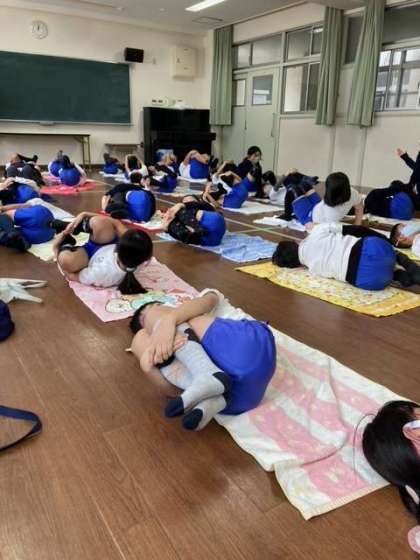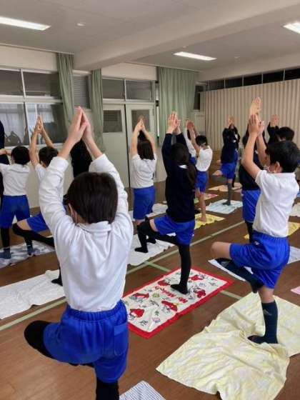 三年生は、出前授業でヨガ教室がありました。トリ、ダンゴムシ、ラッコ、ゾウ、飛行機、木のポーズなど教えてもらいました。はじめに足をほぐすことを教えてもらいましたが、していない足と比較すると、違いがよくわかりました。
