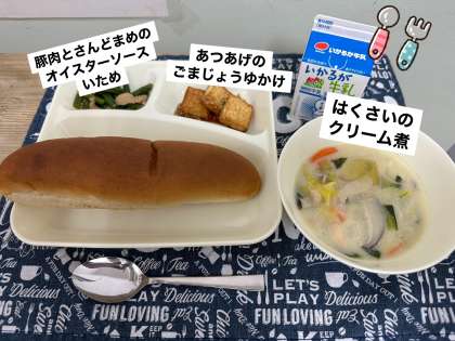 今日の献立は、はくさいのクリーム煮、あつあげのごまじょうゆかけ、豚肉とさんどまめのオイスターソースいため、黒糖パン、牛乳です。
