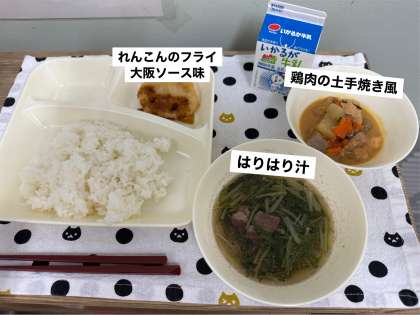 今日の献立は、鶏肉の土手焼き風、はりはり汁、れんこんのフライ大阪ソース味、ごはん、牛乳です。
