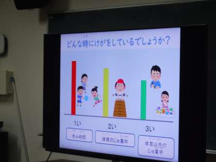 1月18日に2年生最後の二測定を行いました。同時に保健指導では学校で多いけがやその発生場所について学習しました。2年生も残りわずかですが、けが無く健康に過ごしてもらいたいです。