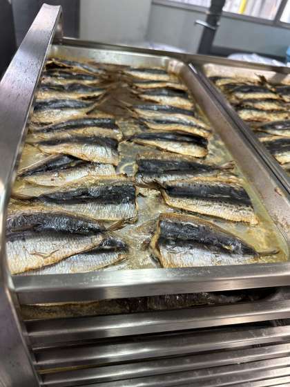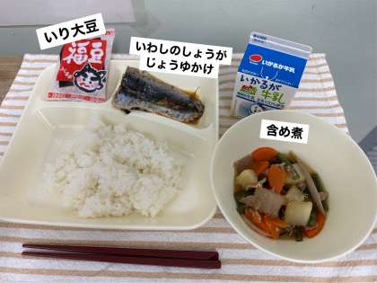 今日の献立は、いわしのしょうがじょうゆかけ、含め煮、いり大豆、ごはん、牛乳です。