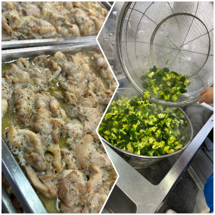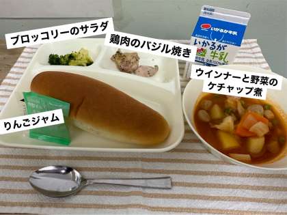 今日の献立は、鶏肉のバジル焼き、ウインナーと野菜のケチャップ煮、ブロッコリーのサラダ、大型コッペパン、りんごジャム、牛乳です。