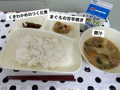 今日の献立は、まぐろの甘辛焼き、豚汁、くきわかめのつくだ煮、ごはん、牛乳です。