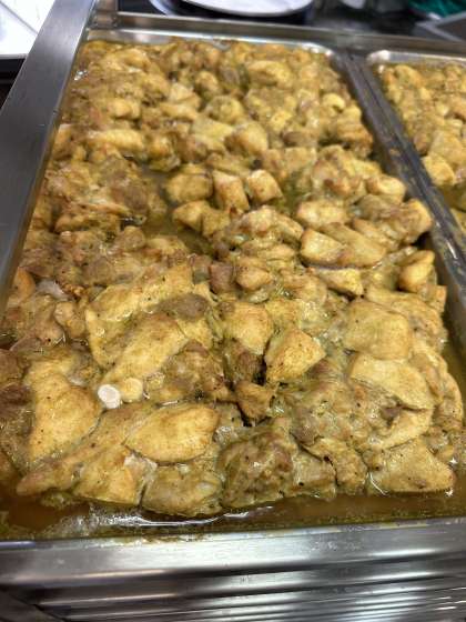 下の写真は【鶏肉のカレー風味焼き】の焼き上がりです。鶏肉にワイン 塩 こしょう ガーリック カレー粉などで下味をつけて焼いています。児童にも大変好評でした。