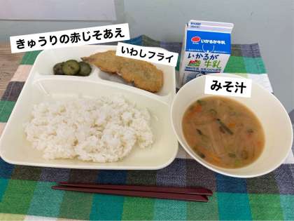 今日の献立は、いわしフライ、みそ汁、きゅうりの赤じそあえ、ごはん、牛乳です。