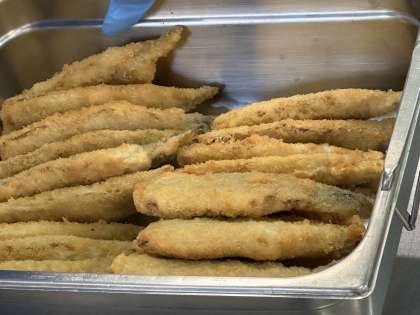 今日は、いわしをフライにしているので、ほねごと食べることができ、ほねや歯をじょうぶにするカルシウムもたくさんとることができます。