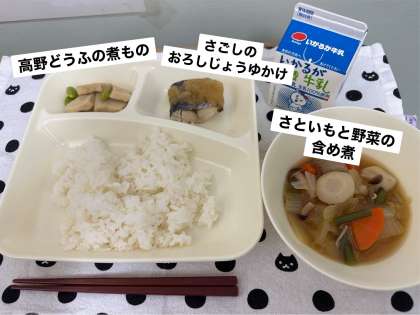 今日の献立は、さごしのおろしじょうゆかけ、さといもと野菜の含め煮、高野どうふの煮もの、ごはん、牛乳です。