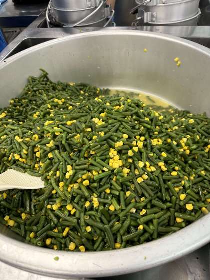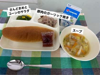 今日の献立は、豚肉のガーリック焼き、スープ、さんどまめとコーンのサラダ、大型コッペパン、いちごジャム、牛乳です。