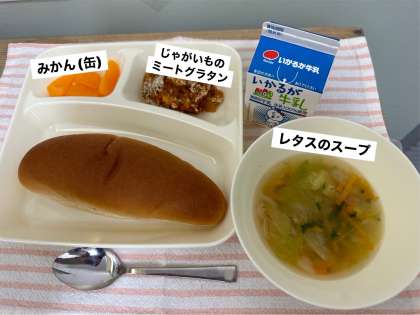 今日の献立は、じゃがいものミートグラタン、レタスのスープ、みかん(缶)、黒糖パン、牛乳です。