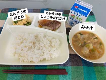 今日の献立は、あかうおのしょうゆだれかけ みそ汁 えんどうの卵とじ ごはん 牛乳です。