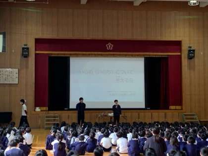 全校朝会で、校長先生による絵本の読み聞かせを通して、いじめられている人、その人の家族や友だちの気持ちについて考えるなど真剣に話を聞いていました。