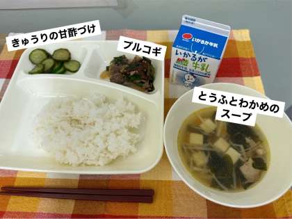 今日の献立は、プルコギ、とうふとわかめのスープ、きゅうりの甘酢づけ、ごはん、牛乳です。