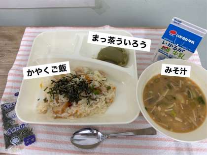 今日の献立は、かやくご飯、みそ汁、まっ茶ういろう、牛乳です。