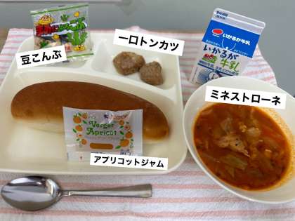 今日の献立は、一口トンカツ、ミネストローネ、豆こんぶ、大型コッペパン、アプリコットジャム、牛乳です。
