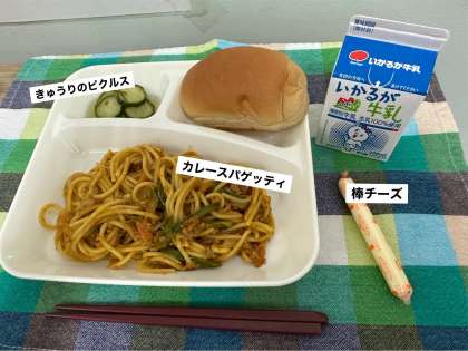 今日の献立は、カレースパゲッティ、きゅうりのピクルス、棒チーズ、黒糖パン(1/2)、牛乳です。