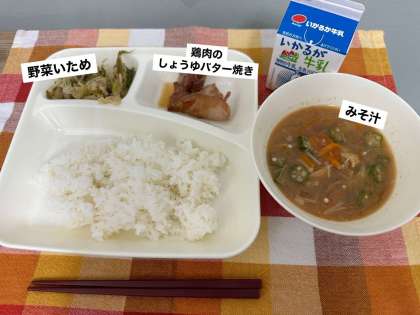 今日の献立は、鶏肉のしょうゆバター焼き、みそ汁、野菜いため、ごはん、牛乳です。