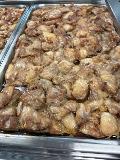 今日は 料理酒とこいくちしょうゆで下味をつけた鶏肉に、湯煎で溶かしたバターをかけて焼き物機で焼いています。児童にも大変好評な献立です。