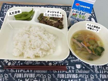 今日の献立は、チンジャオニューロウスー、ハムと野菜の中華スープ、えだまめ、ごはん、牛乳です。