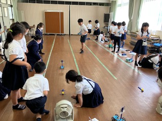 はじめに、送風機の風(強弱)を車の帆にあて車が走る距離を調べました。