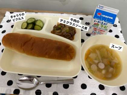 今日の献立は、牛肉のデミグラスソース煮、スープ、きゅうりのピクルス、おさつパン、牛乳です。