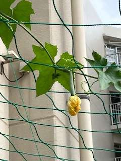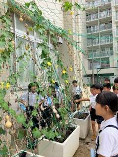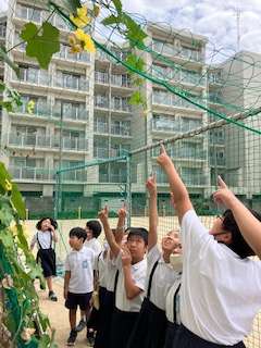 4年理科では、育てているヘチマにやっと雌花が咲き、受粉もできて、実がなるところが膨らんできました。子どもたちと観察して、実がなりかけている雌花を探しました。子どもたちは、これから大きくなるヘチマを楽しみにしています。