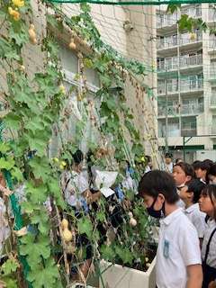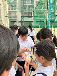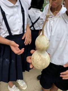 4年理科では育てているヒョウタンを観察しました。白い花が咲いた後、実になり、お馴染みのくびれたヒョウタンになりました。育てている品種は千成りヒョウタンです。枯れたヒョウタンを観察すると、以前観察したヒョウタンより軽くなっていたり、匂いが畳の匂いになっていたり、実を叩くと中が空洞のような感じがしたりと、色々な気づきがありました。