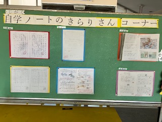 自学ノート(10月分)の玄関掲示を行いました。後期時間割になり、自学ノートにも様々な工夫や成長が見えてきます。2年生では、習った九九の練習を行をそろえて書き込んだり、4年生では、理科の実験をイラストを添えてまとめたり、1年生では、文章を書けるようになっていたり、他の学年も見応えのある自学ノートで、子どもたちの成長がよくわかるノートになっていました。読書の秋と言いますが、秋の夜長に読書をして、感想を自学ノートにまとめることもいいかもしれませんね。