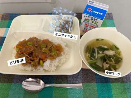 今日の献立は、ピリ辛丼、中華スープ、ミニフィッシュ、牛乳です。
